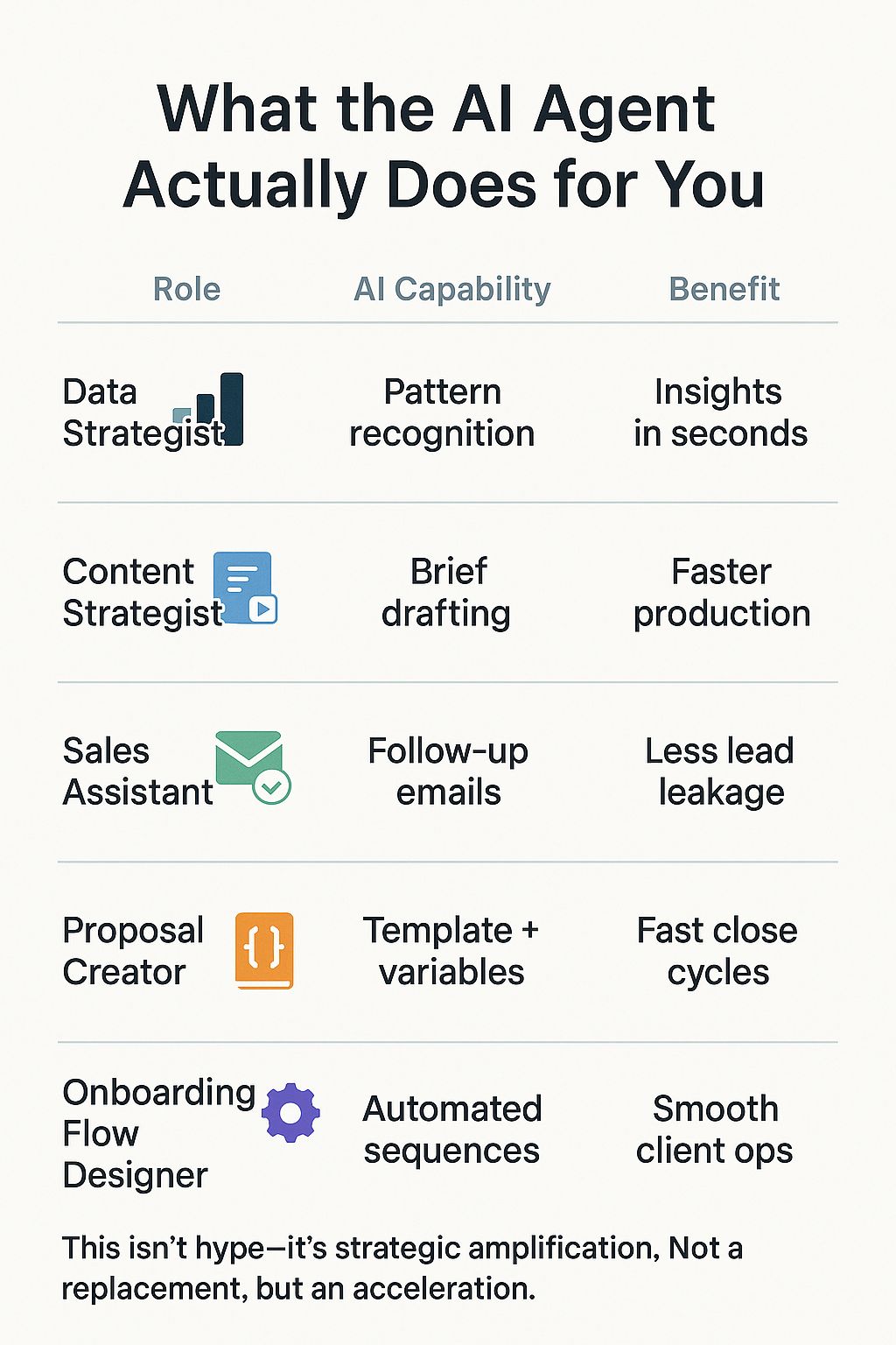 This isn’t about being “AI-first” — it’s about being systems-smart. A single well-placed agent (like automated follow-up or proposal generation) can win back 10+ hours a week. Now imagine stacking five of those. That’s not efficiency — that’s transformation.